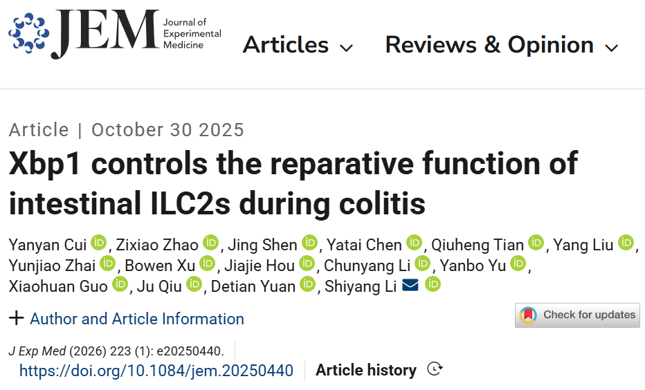2025年10月30日,山东大学李石洋团队在Journal of Experimental Medicine(IF=10.6)在线发表题为“Xbp1 controls the reparative function of intestinal ILC2s during colitis”的研究论文,该研究发现Xbp1控制结肠炎期间肠ILC2s的修复功能。