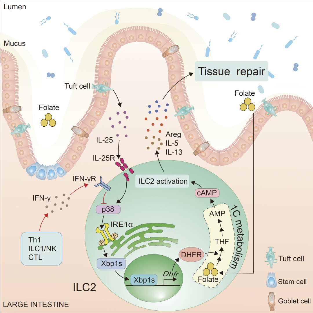 该研究表明,在小鼠结肠炎组织中由于IL-25减少和IFN-γ增多导致ILC2中UPR分支IRE1α-Xbp1通路受损,进而破坏叶酸依赖性的一碳代谢。补充该途径的代谢产物AMP可以促进ILC2功能并缓解肠道炎症。研究结果揭示了UPR在感知肠道组织微环境并调控ILC2功能中的关键作用,并提示叶酸介导的一碳代谢可能成为的潜在治疗靶点。